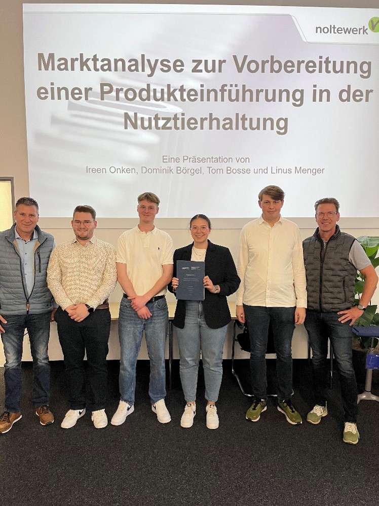 Die zweite Projektgruppe arbeitete mit dem Unternehmen noltewerk in Greven zusammen und erstellte eine detaillierte Marktanalyse zur Vorbereitung einer Produkteinführung im Bereich der Nutztierhaltung. Neben der Untersuchung des bestehenden Wettbewerbs und der Analyse des Marktpotenzials entwickelten die Studierenden einen eigenen Fragebogen, führten Interviews und traten mit Ansprechpartnern sowohl in europäischen Ländern als auch in den USA in Kontakt.