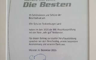 Urkunde für IHK-Beste an die Kaufmännischen Schulen Ibbenbüren Die Kaufmännischen Schulen Tecklenburger Land in Ibbenbüren wurden von der IHK Nord Westfalen für viele Prüfungsbeste des Ausbildungsjahres 2025 ausgezeichnet. Die [...]