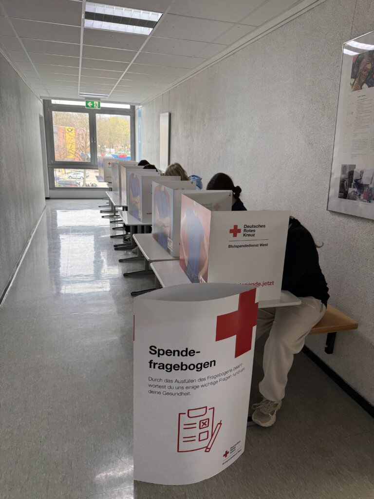 Unsere diesjährige Blutspendeaktion war ein voller Erfolg: 64 Schülerinnen und Schüler sowie Lehrkräfte beteiligten sich und setzten ein starkes Zeichen für gesellschaftliches Engagement. Durch eine gezielte Aufklärungskampagne im Vorfeld konnten wir die Anmeldezahlen deutlich steigern. Weitere Einblicke und Hintergründe zur Organisation durch unsere Schülervertretung gibt es hier.